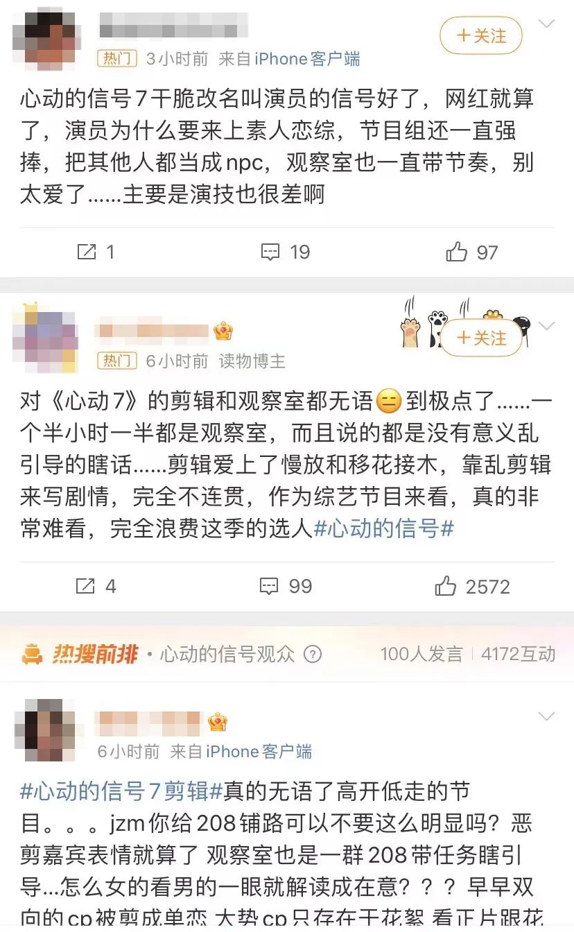 第四期上線後,#心動的信號7剪輯#登上微博熱搜,相關話題下,吐槽剪輯混亂、移花接木、輕重內容呈現不當、時間線混亂等評論幾乎充斥着整個話題。