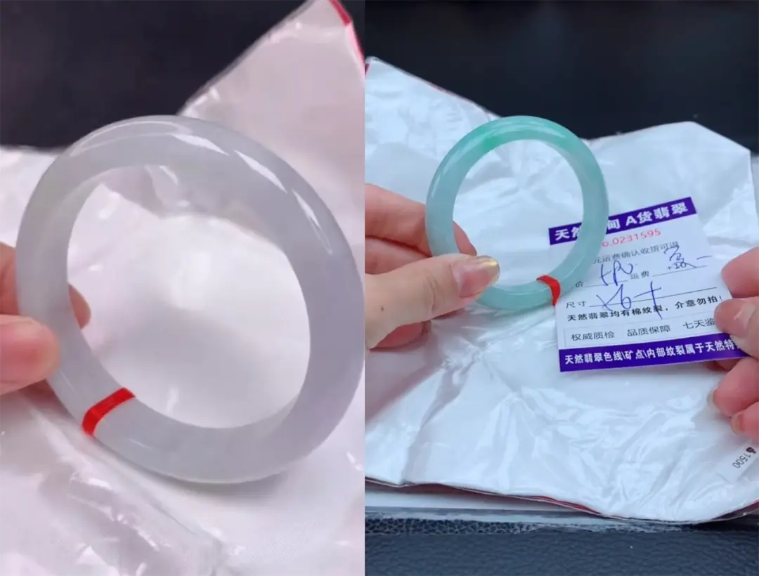 看花色位置是同一只鐲子、同一款吊墜,但質感直接從翡翠變成了“大理石”。
