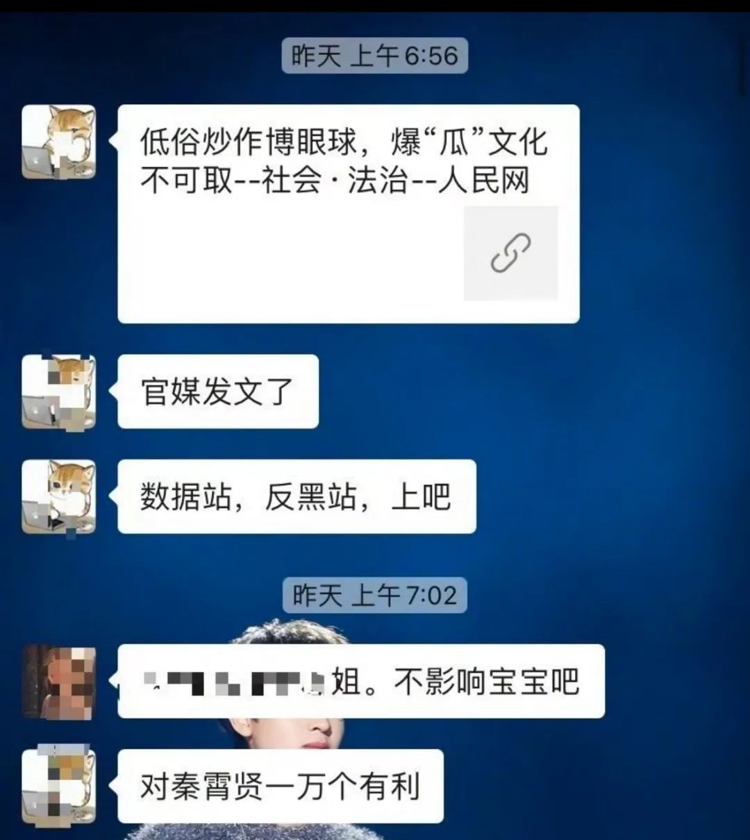 受不住辛雨錫的接連爆料,一位秦霄賢粉絲在羣裏甩出一張“人民網”發文批評女方爆料行為的截圖。
