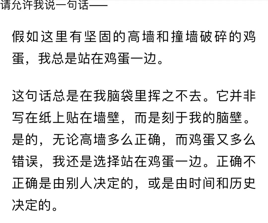 這總是會讓我想起村上春樹關於石牆和雞蛋那段話,“假如有堅固高牆和撞牆破碎的雞蛋,我總是站在雞蛋一邊”。