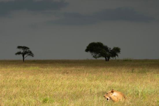 那是一頭剛睡醒的成年母獅子,悠然自得坐在廣袤無垠的草地上,淺棕色的毛髮與腳下的草地幾乎融為一體,而午後的陽光正好將獅子的胸膛染成了金黃色,這讓王秋真切感受到了草原之王的威嚴與力量。