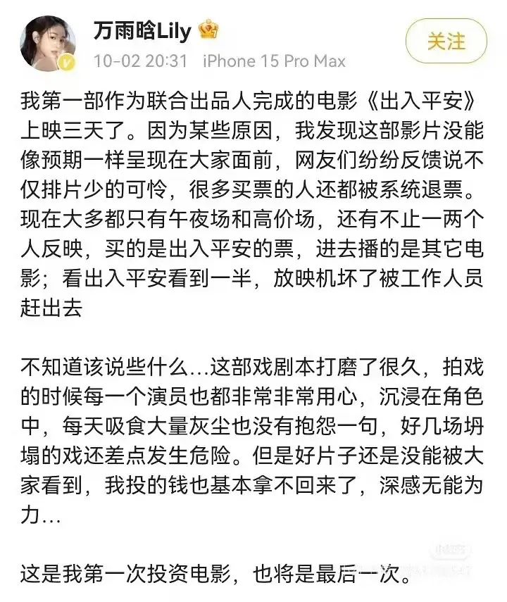 現如今倒推《出入平安》的撤檔,一方面在於電影初期爭取的排片就極其有限,開局就進入到了“地獄模式”;另一方面在於電影排片持續壓縮,10月3日進一步壓縮到了2.1%,儘管主創依然在堅持路演,但是嚴重“排片掉隊”導致影片的宣發動作無法將目標受眾拉進影院,看不到逆襲的可能。
