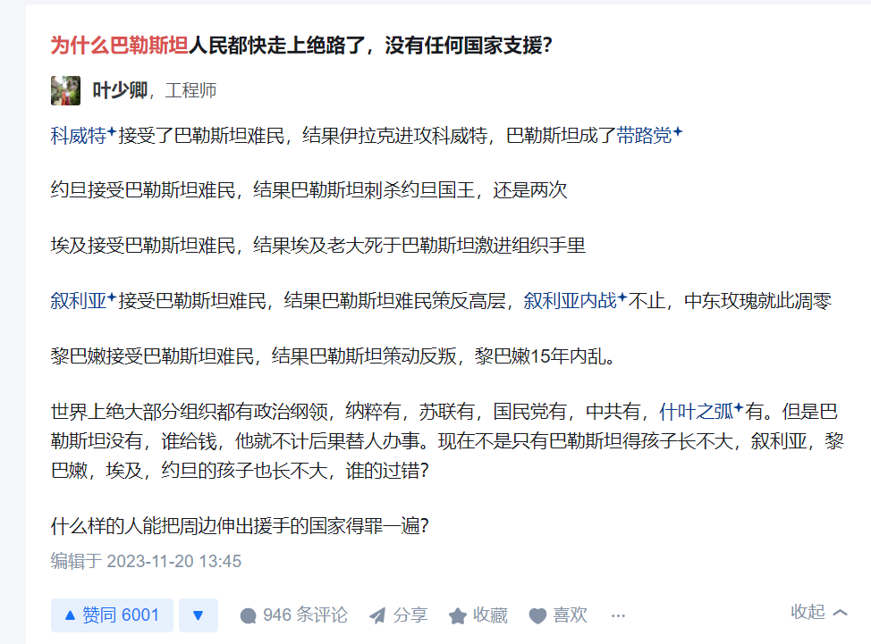 因此,討論巴以問題,必須要把哈馬斯和普通巴勒斯坦人民分開來,幾百萬巴勒斯坦人民,你不能説他們所有人都支持哈馬斯吧?你也不能説他們都是潛在的哈馬斯吧?