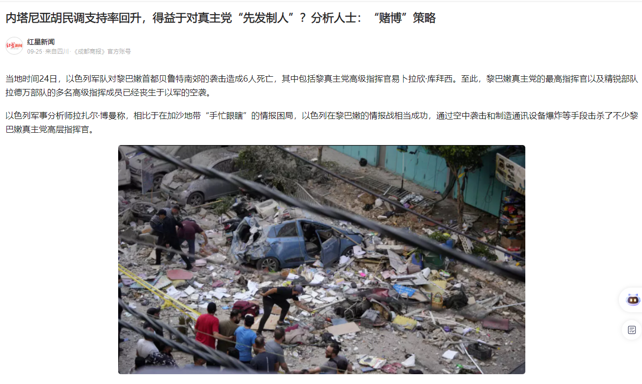 別的不説,內塔尼亞胡因為搞司法改革,在去年10.7哈馬斯搞音樂節恐怖襲擊之前,支持率最低只有20%了,以色列國內抗議連連,眼看着內塔尼亞胡就要下台了,但是這次恐怖襲擊之後,內塔尼亞胡支持率持續走高,後來以色列內部各種抗議,居然都在指責內塔尼亞胡政府打擊哈馬斯還是過於軟弱了,在最近接連暗殺掉哈馬斯和真主黨所有高層以後,內塔尼亞胡支持率又走高了。