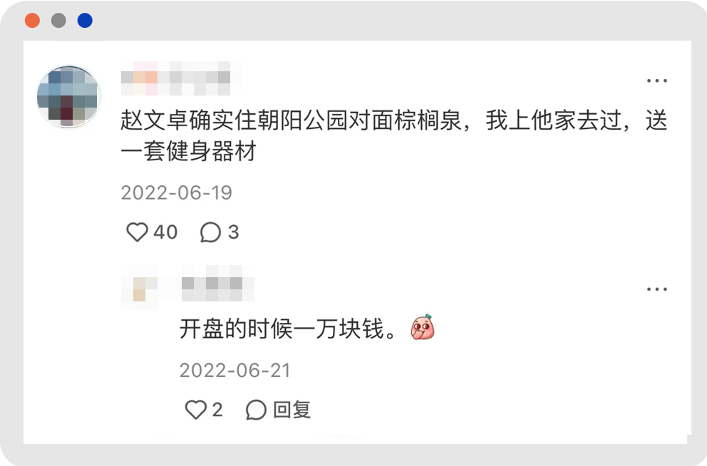 有人説,趙文卓住在朝陽公園對面的棕櫚泉,説自己曾經去送過健身器材。