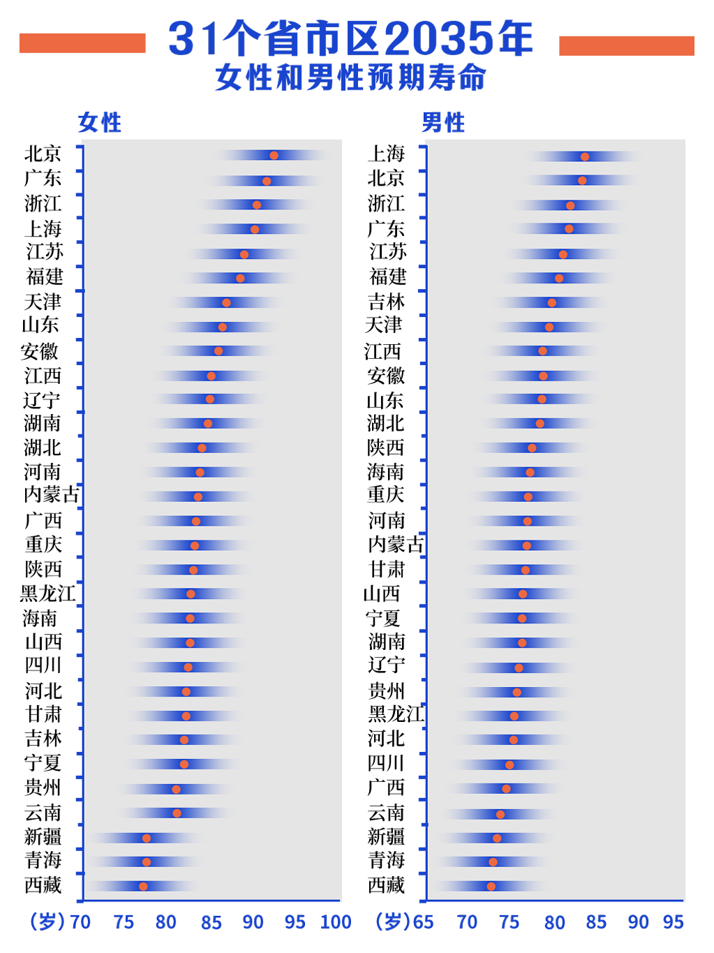 而在《柳葉刀》全國31個省市區2035年女性和男性預期壽命預測中,北京女性預期壽命排名第一、男性排名第二。