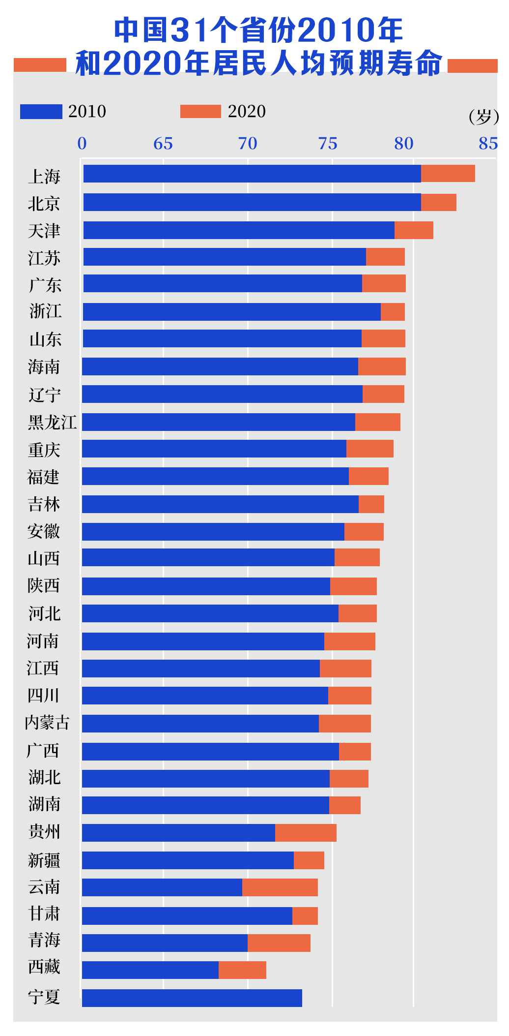 在全國各省2010年和2020年居民人均預期壽命中,北京均排在第二。