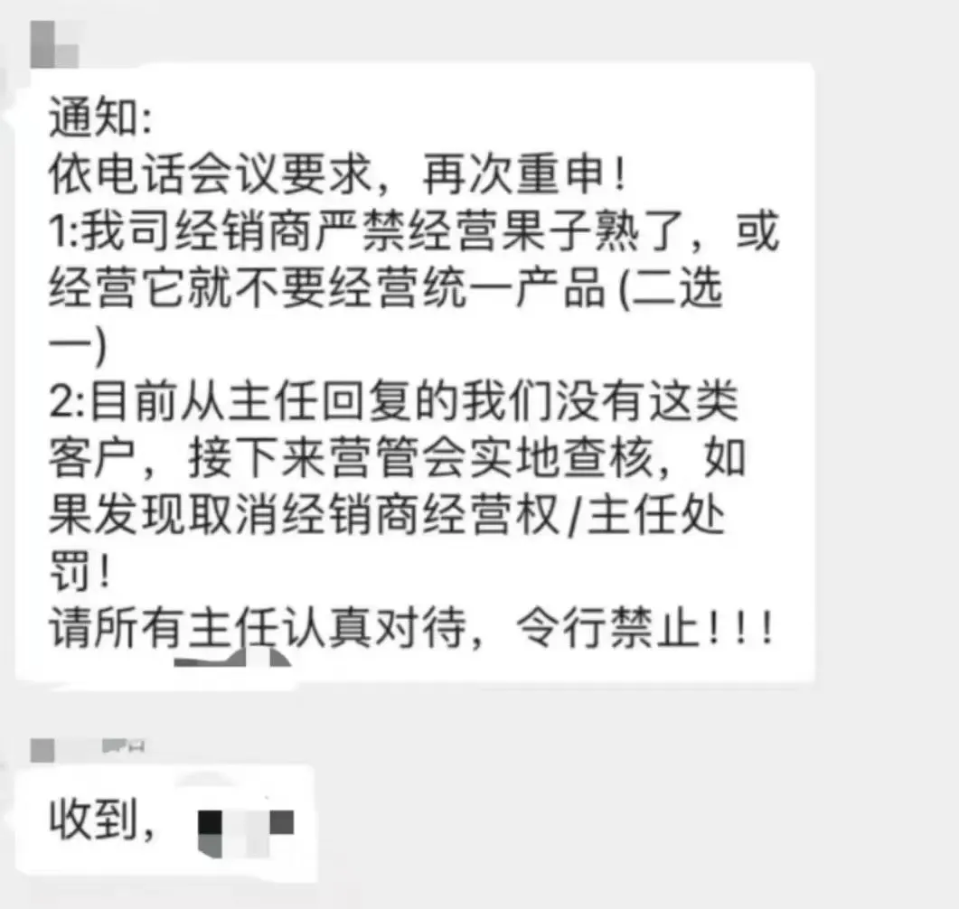 9月25日,據北京商報報道,有業內人士稱,上週統一高層和各大省總們召開了一場電話會議。根據流出的一則通知信息,按照這次電話會議的要求,統一經銷商嚴禁經營果子熟了,或者經營果子熟了就不能同時經營統一旗下的產品,必須“二選一”。