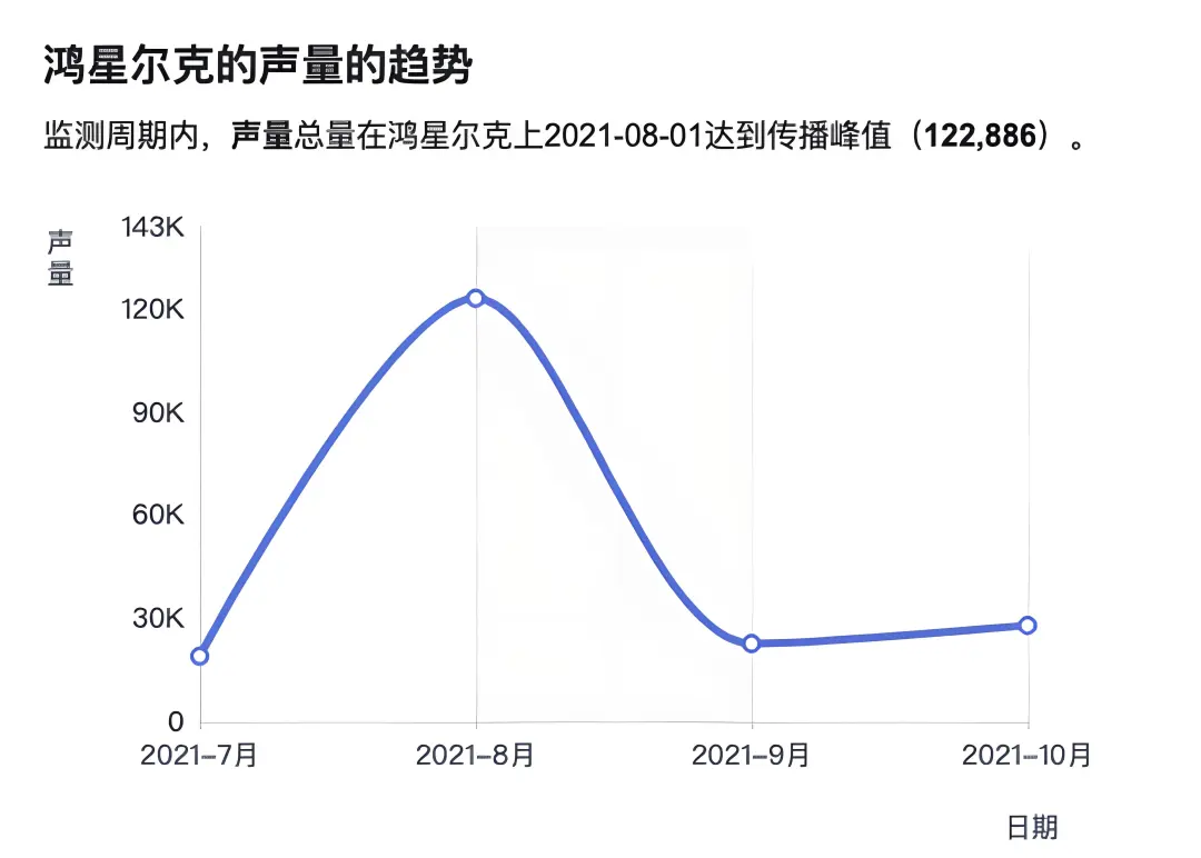 當時根據慧科訊業輿情監測的數據顯示,在2021年7月-10月的監測週期內,鴻星爾克的聲量總量在8月1日達到傳播峯值,隨後出現斷崖式下跌,9月份之後趨於穩定。而在10月11日左右又迎來一波傳播小高峯,原因在於鴻星爾克再次捐贈2000萬物資馳援山西,但數據已然遠不及8月。