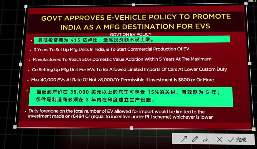 直到臨近今年大選,莫迪才終於鬆口,明文把進口電車的税收從 70% 降到 15%,不過獲得税收優惠的條件嘛。。。還是得企業承諾在三年內至少投資 415 億盧比,而且還是得在印度建廠。關税降了,但也沒降。