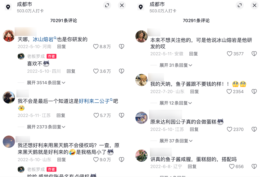 一期視頻宣傳了魚子醬蛋糕跟冰山熔岩兩個品,評論區用户對於這種小故事性質的介紹,特別買賬,這還只是自家產品系列的其中一集。
