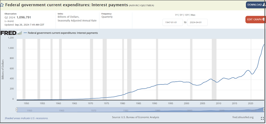 美國政府過去一年的利息支出,已經達到了1.1萬億美元。而美國去年的財政收入為4.4萬億美元。