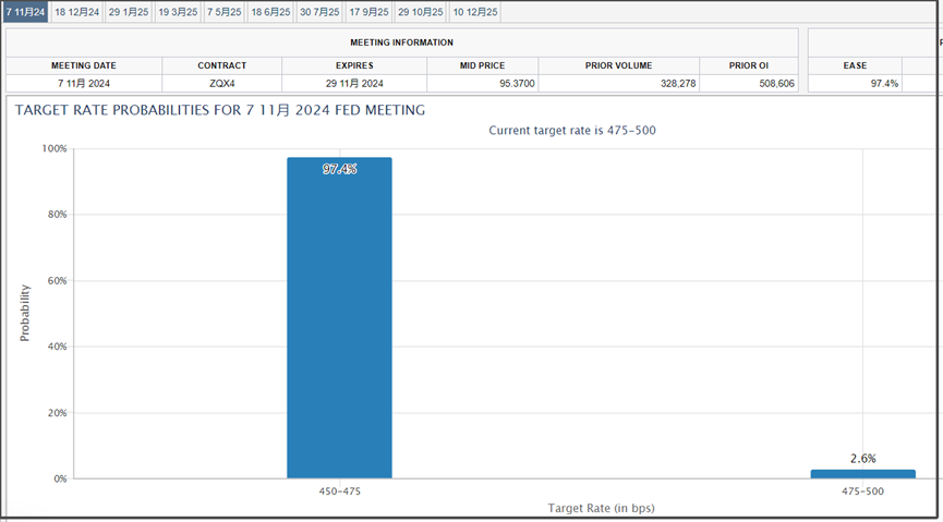 芝商所的美聯儲觀察工具顯示,數據公佈前,市場預期美聯儲11月降息50基點概率是超過30%,但在數據公佈後,市場預期11月降息50基點概率基本為0,預期11月降息25基點的概率是97.4%;