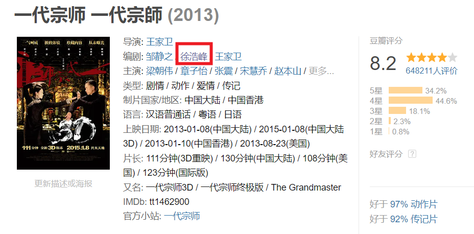 在電影行業裏也給很多大片當過編劇,你比如王家衞的《一代宗師》就是他寫的本子。