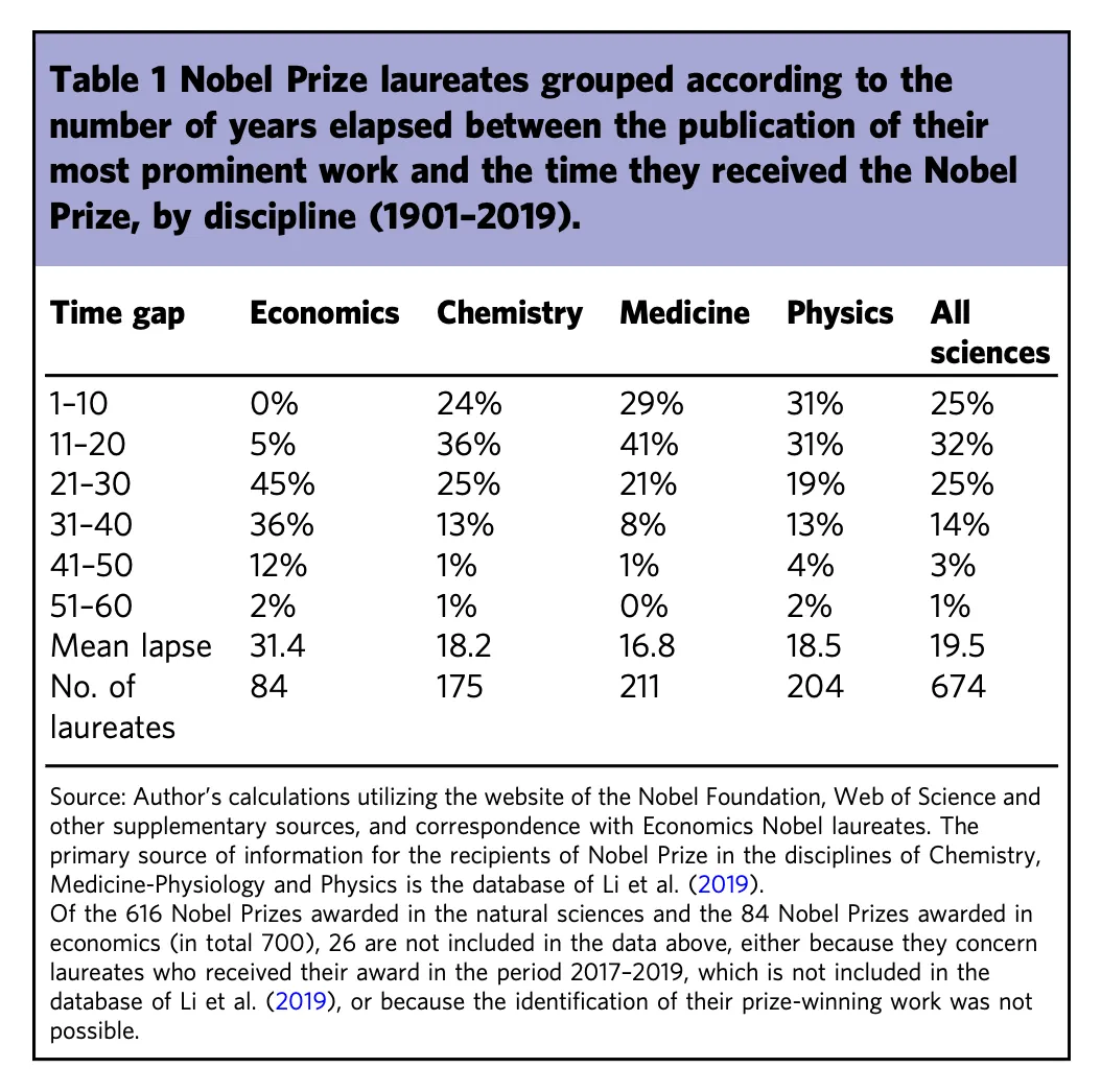 根據收集到的數據,科學家發現,其實有相當一部分(18%)的獲獎者在他們有代表性的著作發表30多年後才獲獎,25%的研究者需要等20多年,而大多數(32%)的科學家則需要等10多年。而更顯著的是,其中等得最久的,可能就是經濟學領域的研究者。
