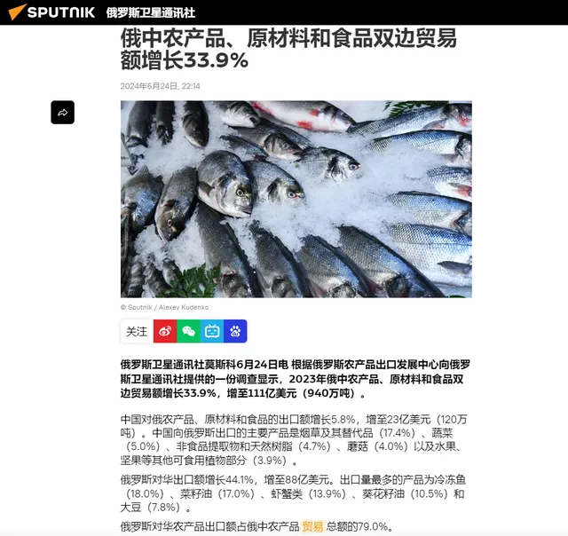 今年6月24日,俄農產品出口發展中心在向衞星社提供的一份調查報告中提到,2023年,中俄農產品、原材料和食品雙邊貿易額增長33.9%,增至111億美元。其中,俄羅斯對華出口額增長44.1%,增至88億美元。俄羅斯對華出口量最多的產品為冷凍魚(18.0%)、菜籽油(17.0%)、蝦蟹類(13.9%)、葵花籽油(10.5%)和大豆(7.8%)。截至2023年,俄羅斯對華農產品出口額已經佔到了中俄農產品貿易總額的79.0%。