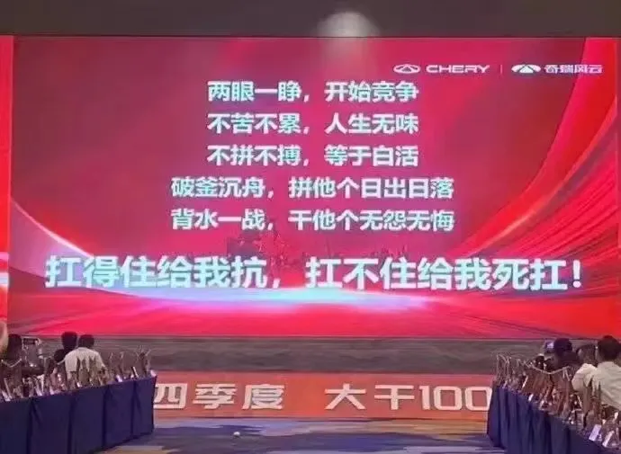 一位知情人士回應,“圖片確實出自奇瑞華南,活動是前幾天舉辦的。”如今激進的標語,有網友感慨:“頗有當年房地產那味兒了!”