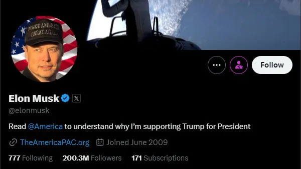 此外,馬斯克還把自己得社交媒體頭像換成戴有川普"MAGA”主義帽子的圖片。