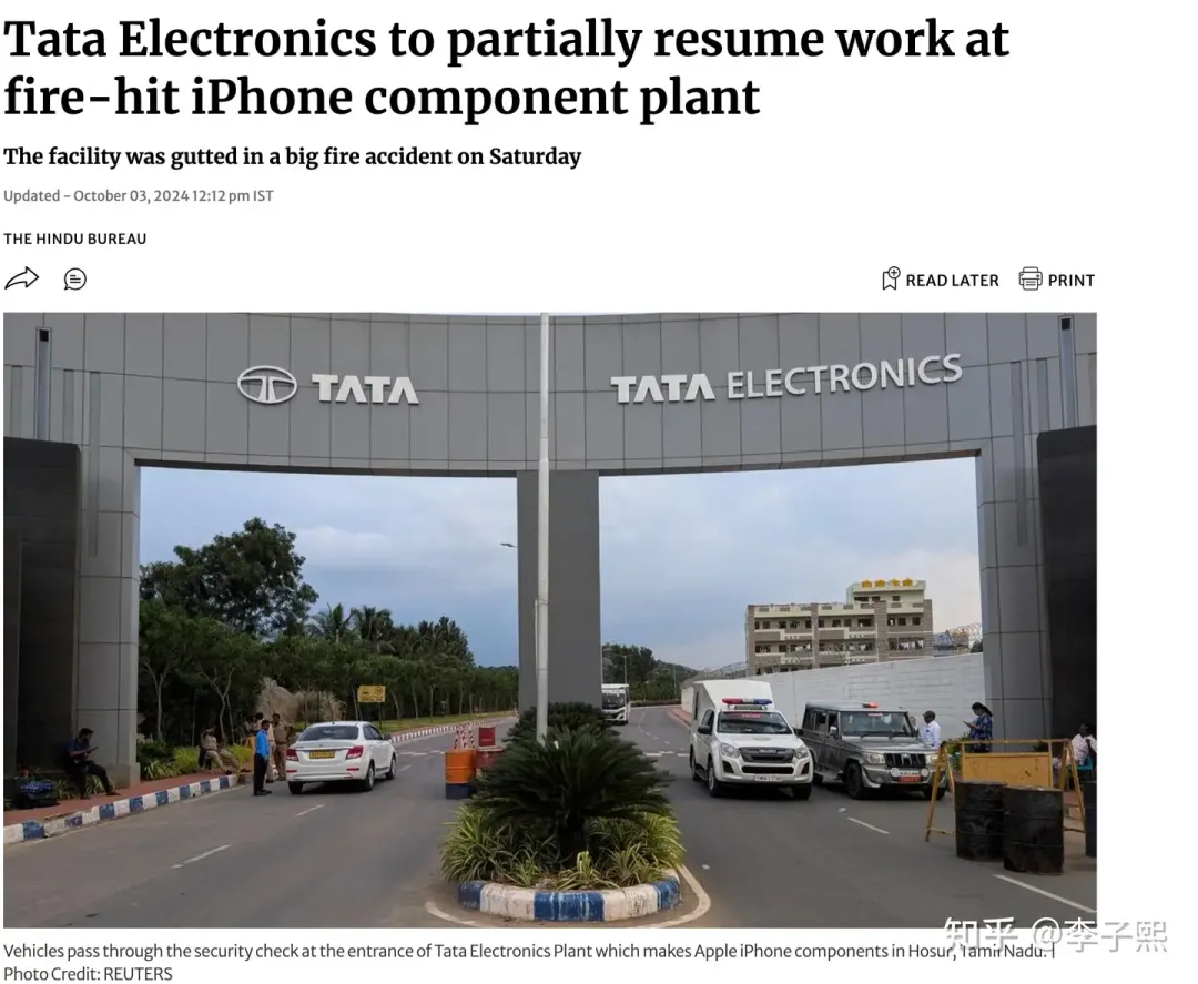 9月28日清晨,印度塔塔電子蘋果手機零部件工廠起火。目前,這家位於泰米爾納德邦霍蘇爾市的工廠仍處於無限期停產狀態。