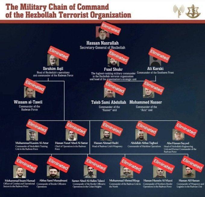 9月26日,真主黨無人機部隊指揮官穆罕默德·侯賽因·薩魯爾在以色列對貝魯特南郊的襲擊中身亡。9月24日,真主黨火箭與導彈部隊指揮官易卜拉欣·穆罕默德·卡比西在以軍對貝魯特南部郊區的空襲中身亡。9月20日,真主黨精鋭部隊拉德萬部隊指揮官易卜拉欣·阿基勒、艾哈邁德·馬哈茂德·韋赫比等多人被以軍擊斃。7月30日,以色列通過無人機襲擊殺死了真主黨最高級軍事官員福阿德·舒克爾。7月18日晚間,以軍戰機在空襲中打死拉德萬部隊高級指揮官阿里·賈法爾·馬圖克。6月11日晚,以色列襲擊黎巴嫩南部地區造成真主黨高級指揮官薩米·阿卜杜拉死亡。6月3日,以色列在提爾地區的霍赫鎮對真主黨阿齊茲部隊的指揮官進行了“斬首”行動,造成指揮官穆罕默德·納賽爾當場死亡。