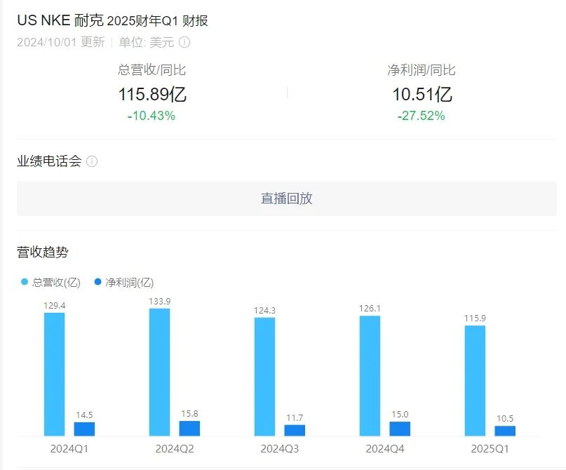而最新耐克發佈的2025財年第一季度財務數據似乎也印證了Alex的看法:本季度大中華區的銷售收入為16.7億美元,儘管高於分析師預期的16.2億美元,但去年同期為17.35億美元,在匯率不變基礎上下降3%。在全球市場,耐克營收也不及預期,收入115.9億美元,同比下跌10.4%;利潤10.5億美元,同比下跌27.6%。