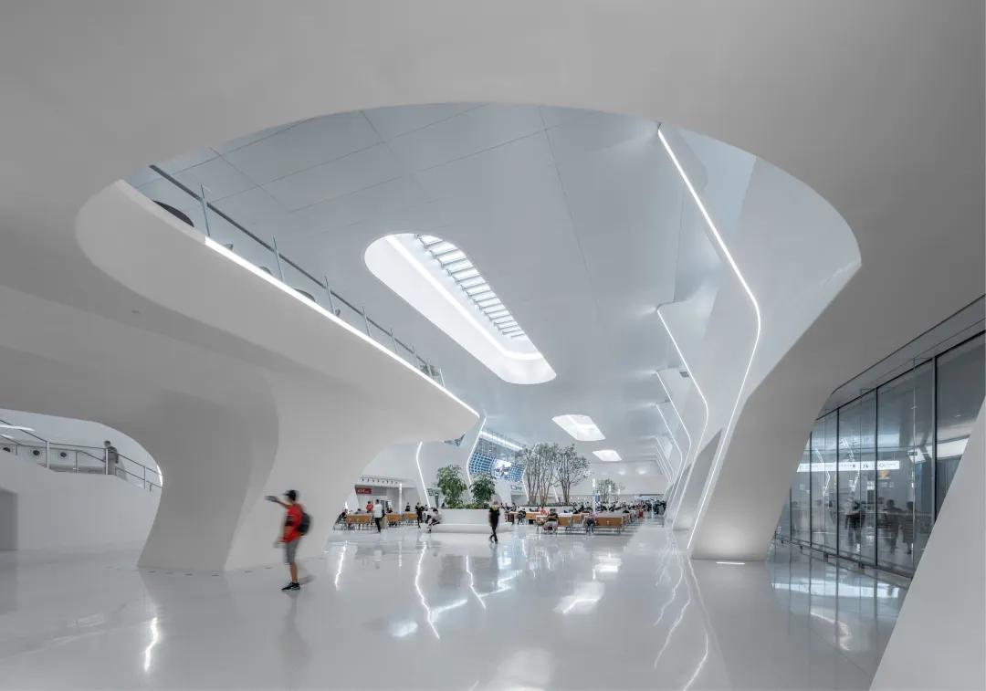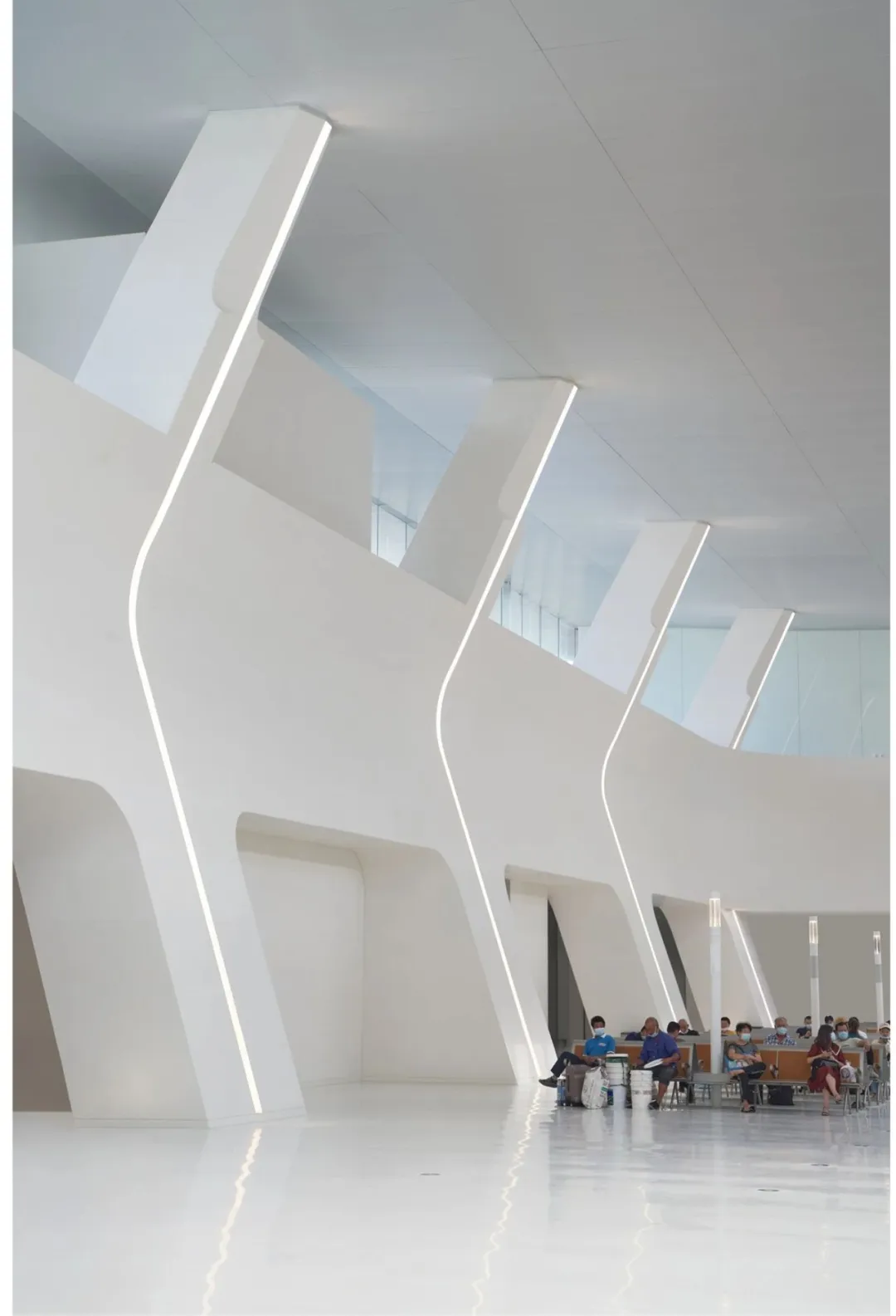 連續的線型燈為空間提供柔和的漫射光,安撫着旅客旅途中焦急等待的情緒