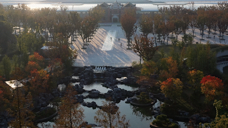 俯視角度下,火車站被掩映在了城市公園中,看到假山、疊水、樹陣,人民公園的邊界也因此拓展了至少一倍