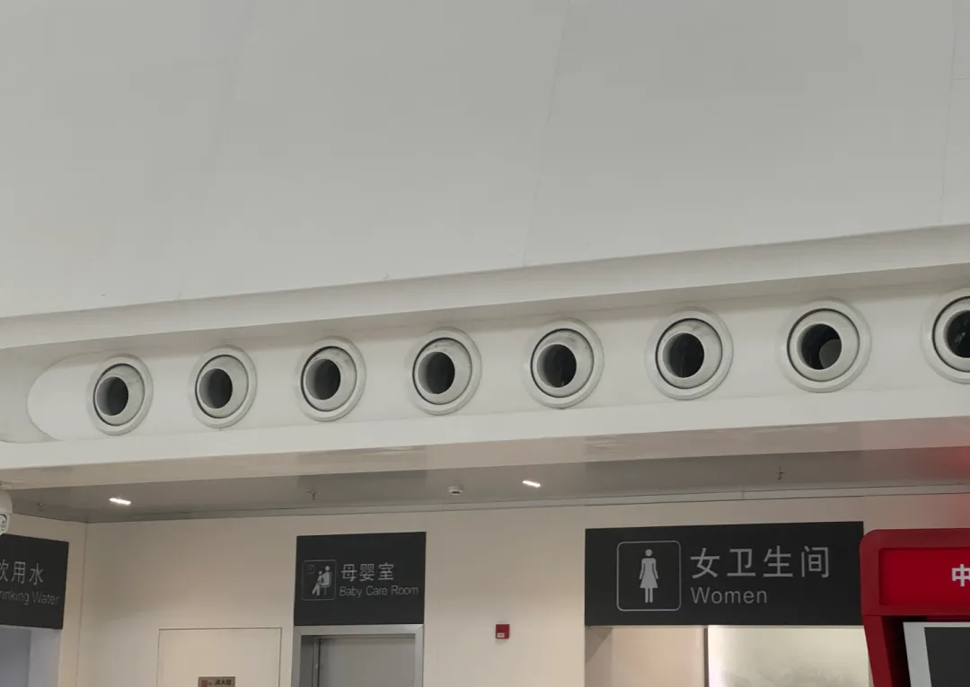 原來仔細一看,是整個大廳的通風系統遍佈空間上方