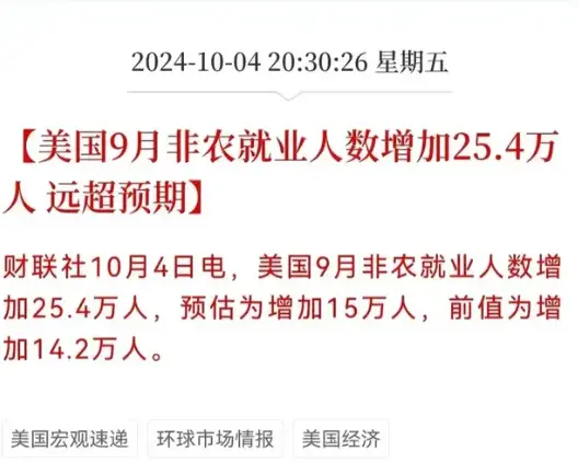 10月4日,美國統計局公佈了一份非常“炸裂”的非農就業數據,宣佈9月份美國的非農數據增加了25.4萬人,遠超市場預計的15萬人。