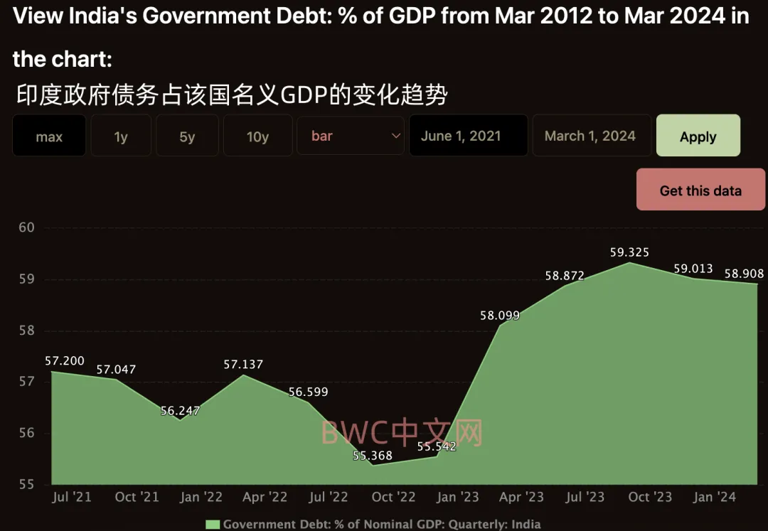 據IMF在9月最新發布的報告顯示,印度是所有新興市場中債務率最高的國家,截至3月,印度國家債務佔該國名義GDP的比例已經升至58.9%,且為2018年以來的最高水平,這其中,僅2024財年外部美元債務就佔到18.9%,目前,印度聯邦的總負債為160.69萬億盧比。
