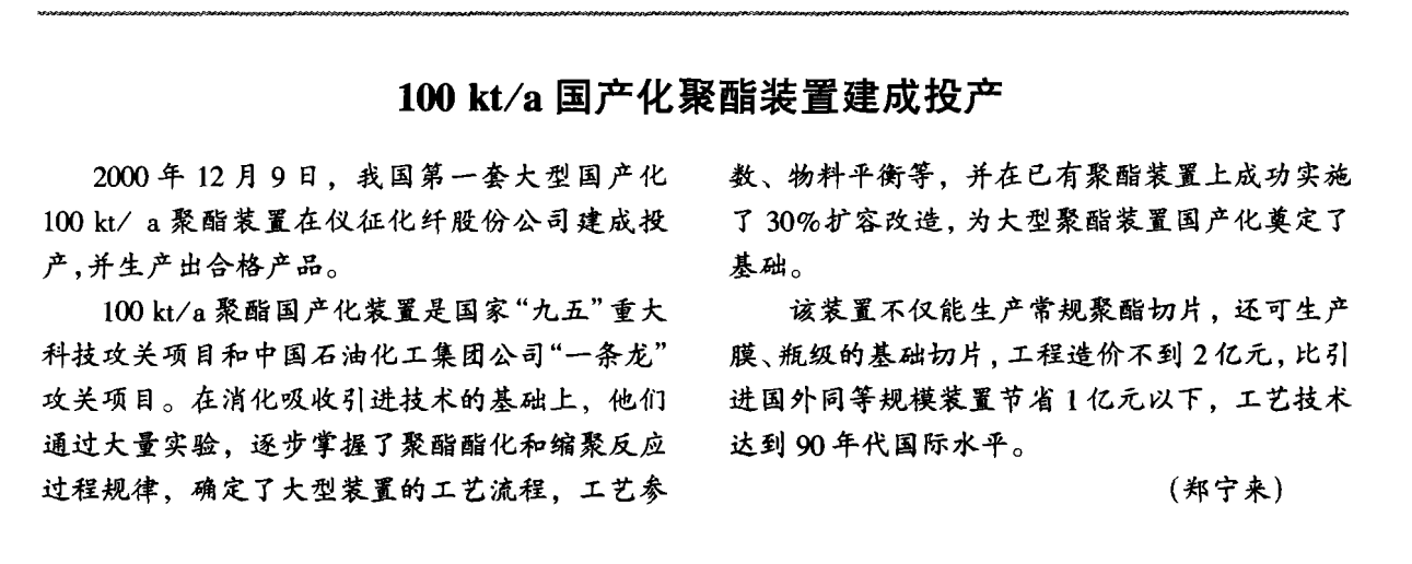 其中僅崑崙工程公司(中國紡織工業設計院)擁有自主知識產權的年產20萬噸PET和年產百萬噸級PTA成套技術和裝備,建成的規模已佔全國21世紀新增能力的85%左右,此外還通過國際競標,在印度、巴基斯坦、阿聯酋等國建設了約800萬噸PTA、PET交鑰匙工程。