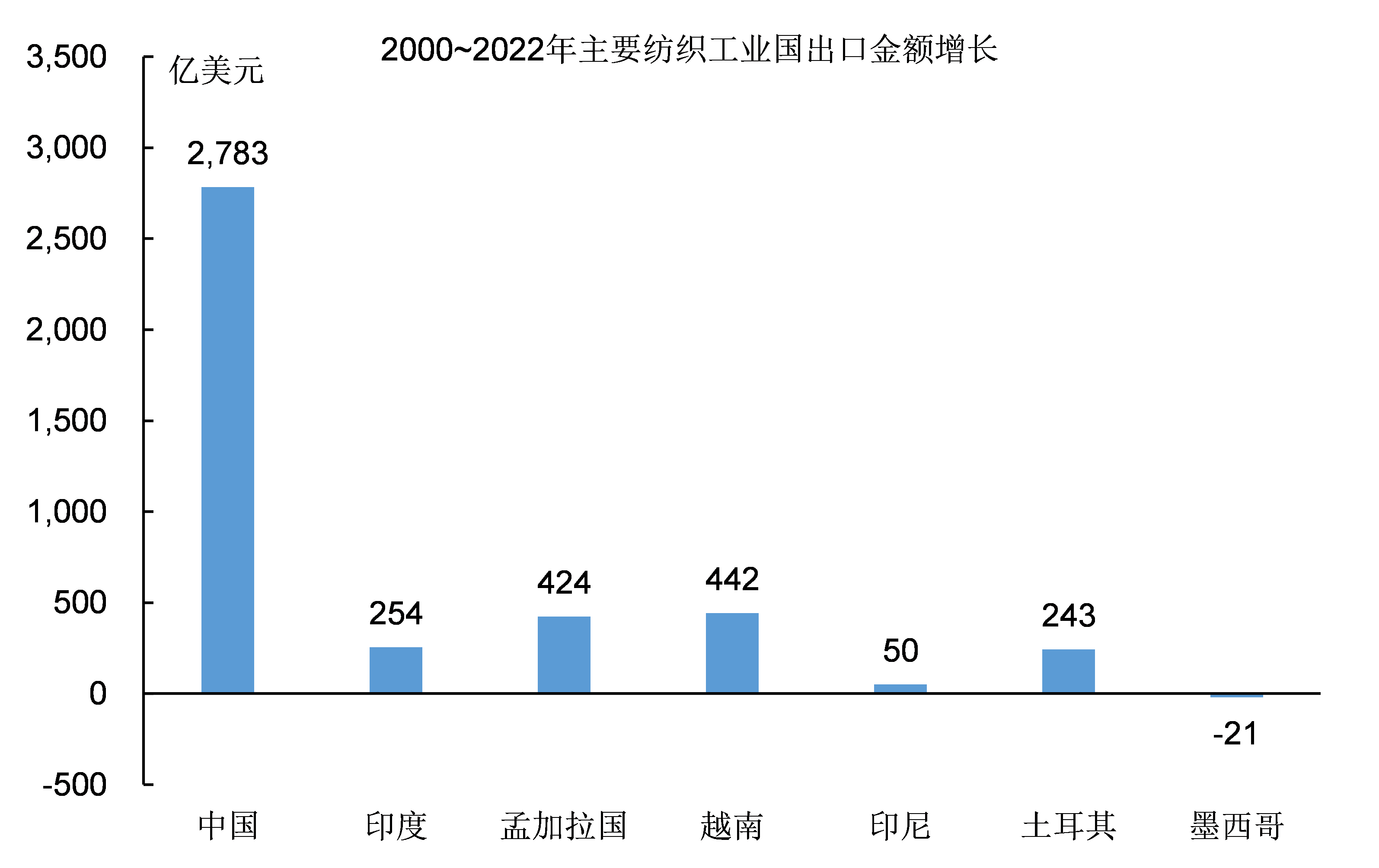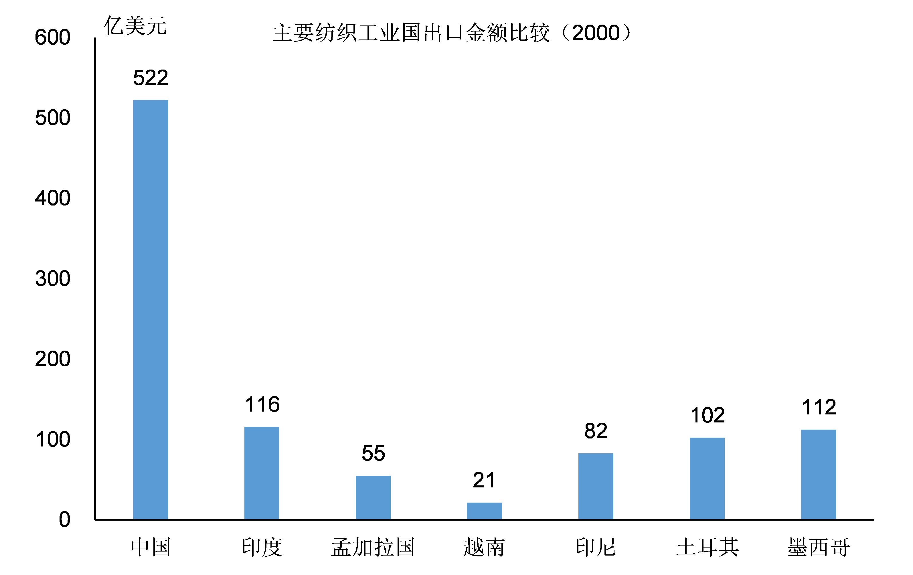 中國以外的國家,服裝紡織產品出口的規模最多不過400億美元,即使是人口規模最大的印度的出口規模也只有300多億美元。除了中國以外,其它紡織工業國的出口規模在全球市場的份額基本不超過5%。