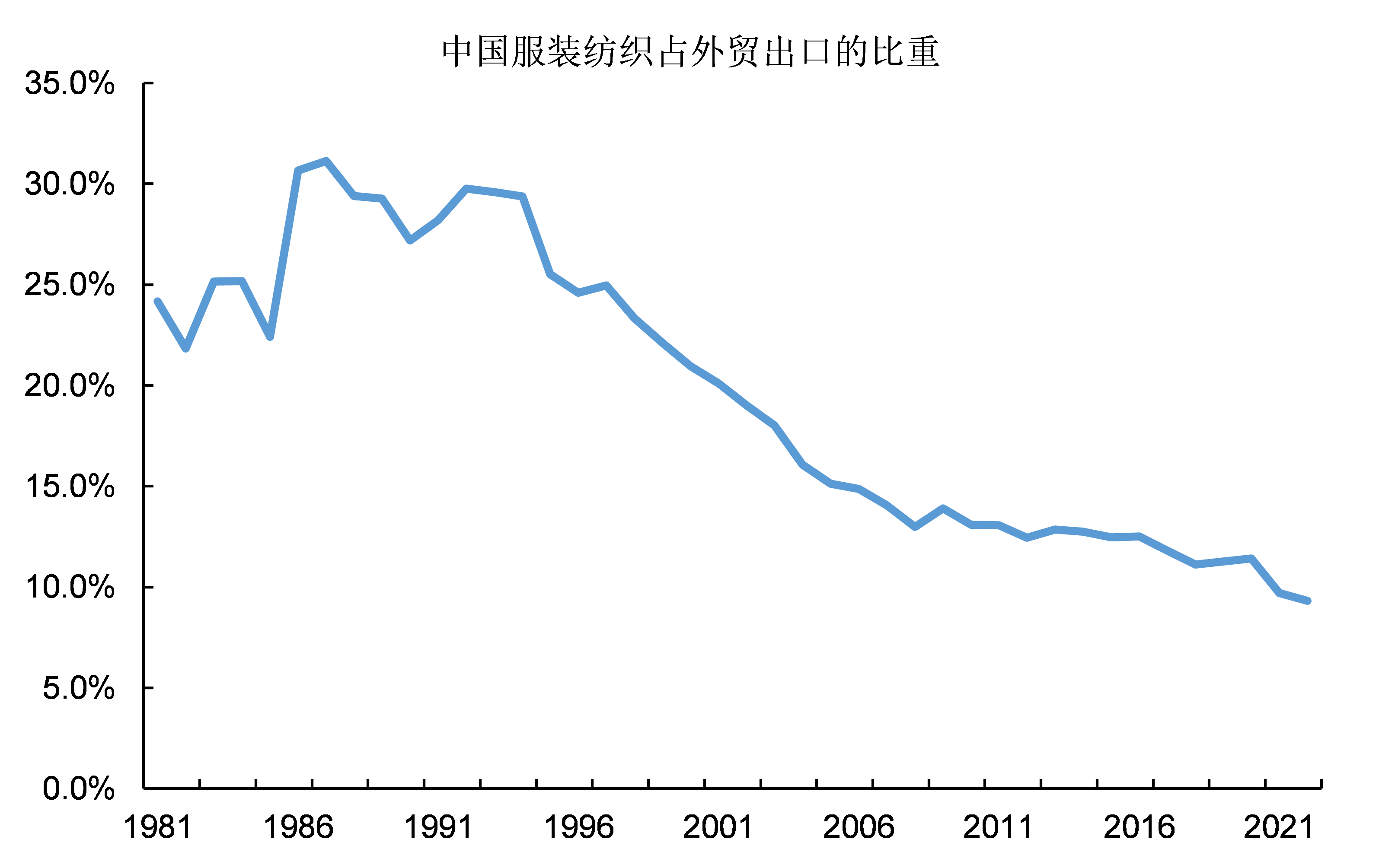 2000年以前,服裝紡織產品出口在中國商品出口中的比重基本都在20%以上,甚至一度曾經超過30%。