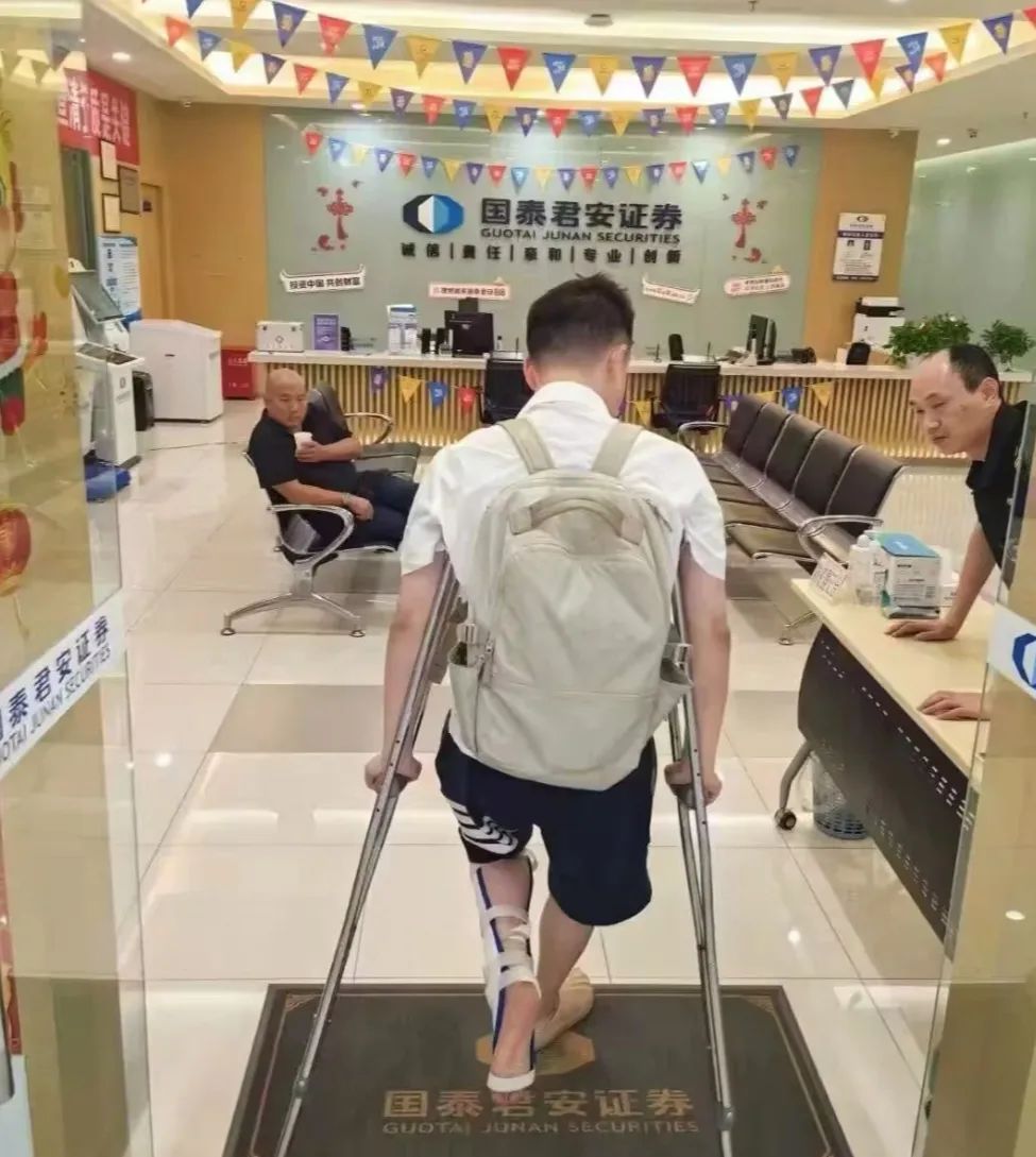即使腿部受傷,照樣難以阻擋欲與股海共沉浮的決心,你以為帶投資者前來開户的是手上撐着的兩支枴杖嗎?