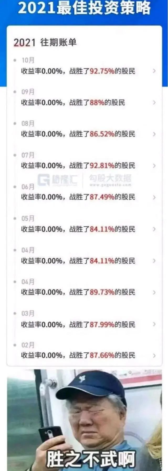 一邊是一頓操作猛如虎,K線圖宏觀微觀各種行研技術流樣樣精通,結果年度內各月收益率還不如自己一分錢沒買的親戚,只感慨“勝之不武”啊……