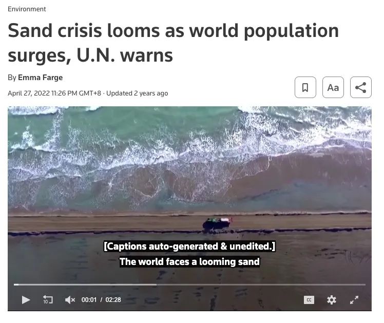 聯合國環境規劃署( UNEP )在 22 年就發佈研究報告説,地球上的沙子資源僅為 6000 億噸,而全球範圍內每年平均開採 500 億噸建築用砂,是所有河流每年輸送的沉積物數量總和的兩倍。