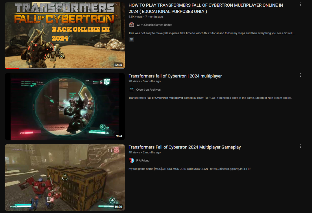 在youtube上,《賽博坦隕落》多人模式的教程視頻和實際遊玩視頻