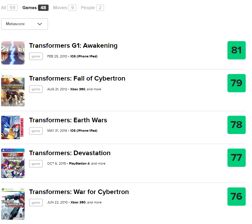除去《賽博坦隕落》等變形金剛遊戲外,