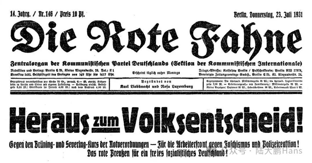 德共《紅旗報》關於解散普魯士邦議會的全民公決的文章