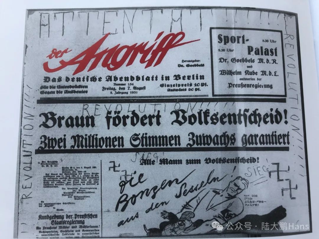 因此,不僅納粹黨和德意志民族人民黨(DNVP)支持全民公決,就連德共居然也和右翼攜起手來了。有一次,納粹黨的宣傳部門負責人戈培爾居然和德共的領導人瓦爾特·烏布利希(Walter Ulbricht,1893—1973)分享一個演講台,共同鼓動全民公決。[2]社會民主黨以及它代表的民主共和精神,遭到了左右夾攻。