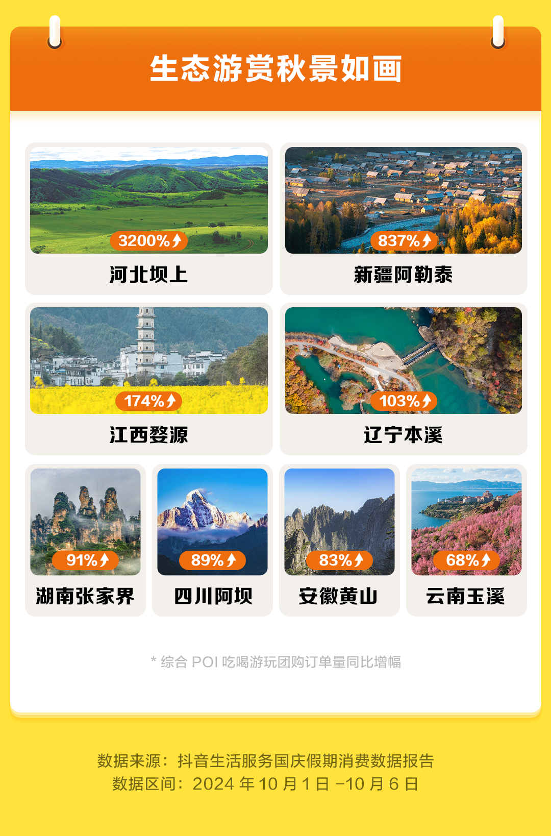 絕美秋色在國慶假期前後“上新”,生態遊品味秋韻成主流。河北壩上草原入選國家林草局、文旅部聯合推薦的特色生態旅遊線路,當地吃喝遊玩相關抖音團購量在假期同比增長3200%。秋色已深的新疆阿勒泰、村落曬秋文化傳承的江西婺源、羣山綿延層林盡染的遼寧本溪相關吃喝遊玩團購訂單量分別同比增長了837%、174%和103%。同時,湖南張家界、四川阿壩、安徽黃山、雲南玉溪等地也迎來了賞秋潮,相關吃喝遊玩團購量明顯增長。