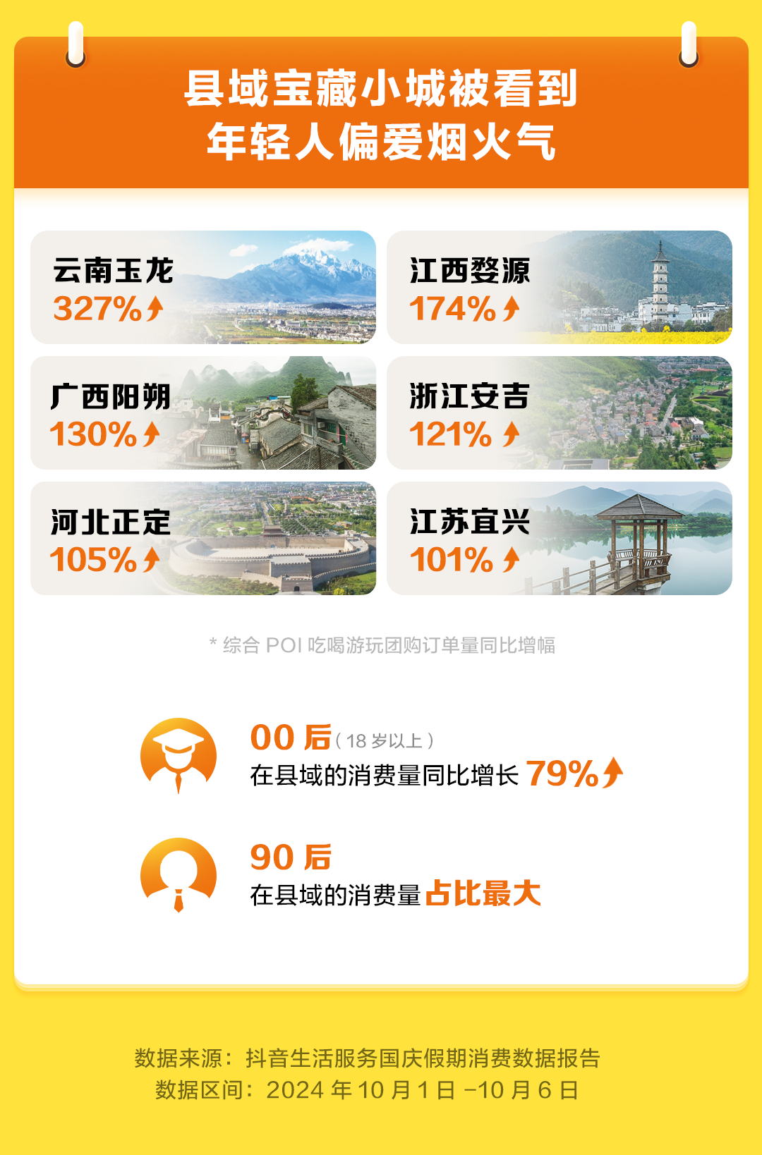 今年國慶假期,一部分年輕人選擇繼續“奔縣”,偏愛小城裏的煙火氣。抖音生活服務數據顯示,10月1日至6日,雲南玉龍在抖音的相關團購訂單量同比增長327%,江西婺源、廣西陽朔、浙江安吉、河北正定、江蘇宜興等特色縣域吃喝遊玩團購訂單量達到去年的2倍以上。