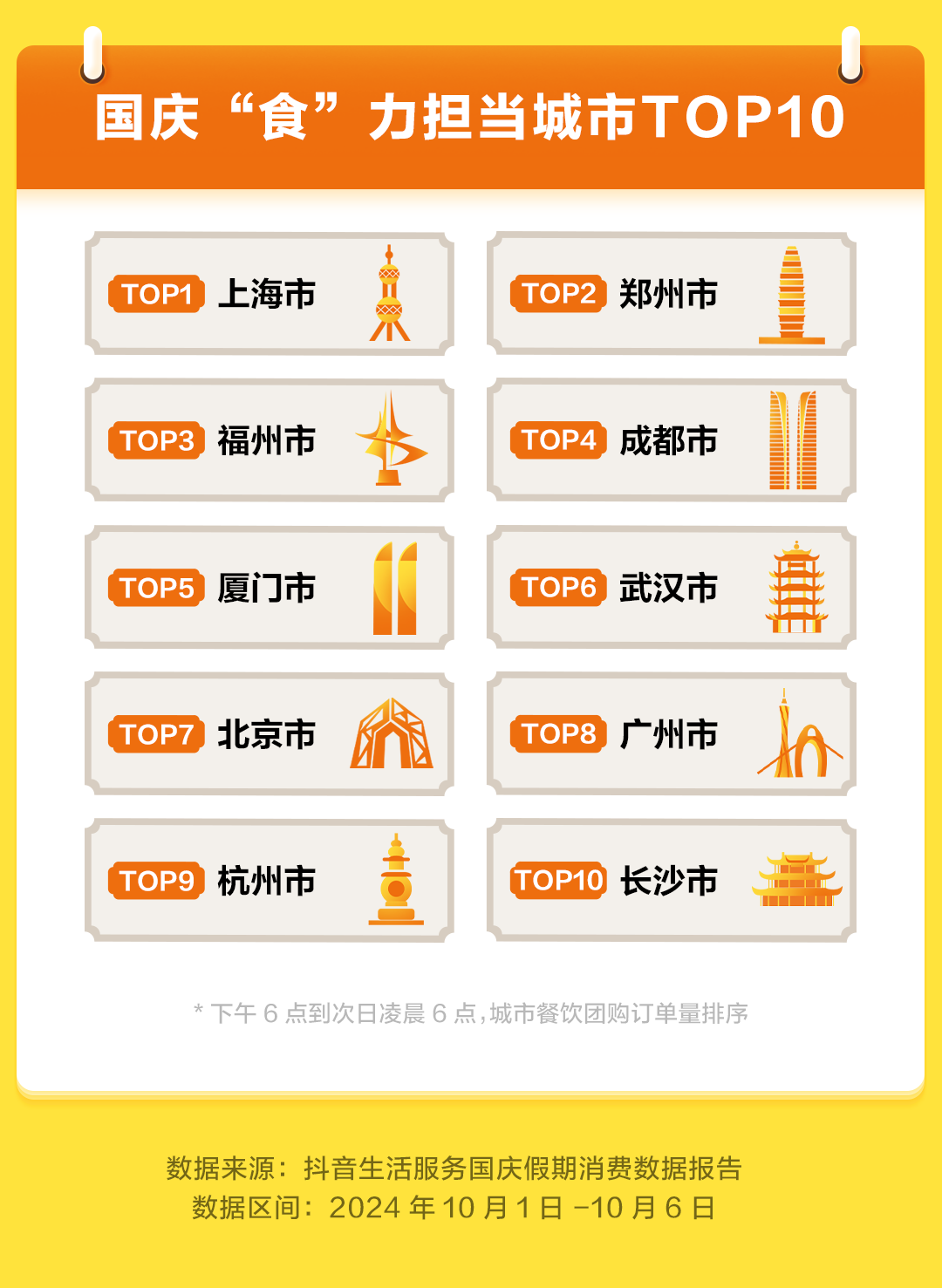“煙火氣”也助力點亮了城市夜經濟。據抖音生活服務數據統計,假期從下午6點至次日凌晨6點,多地城市餐飲團購顯著增長。上海成為全國夜經濟餐飲團購消費首位,鄭州、成都、福州、廈門緊隨其後,位列前五。武漢、北京、廣州、杭州、長沙夜經濟餐飲消費量也頗具規模,居全國城市榜單前列。