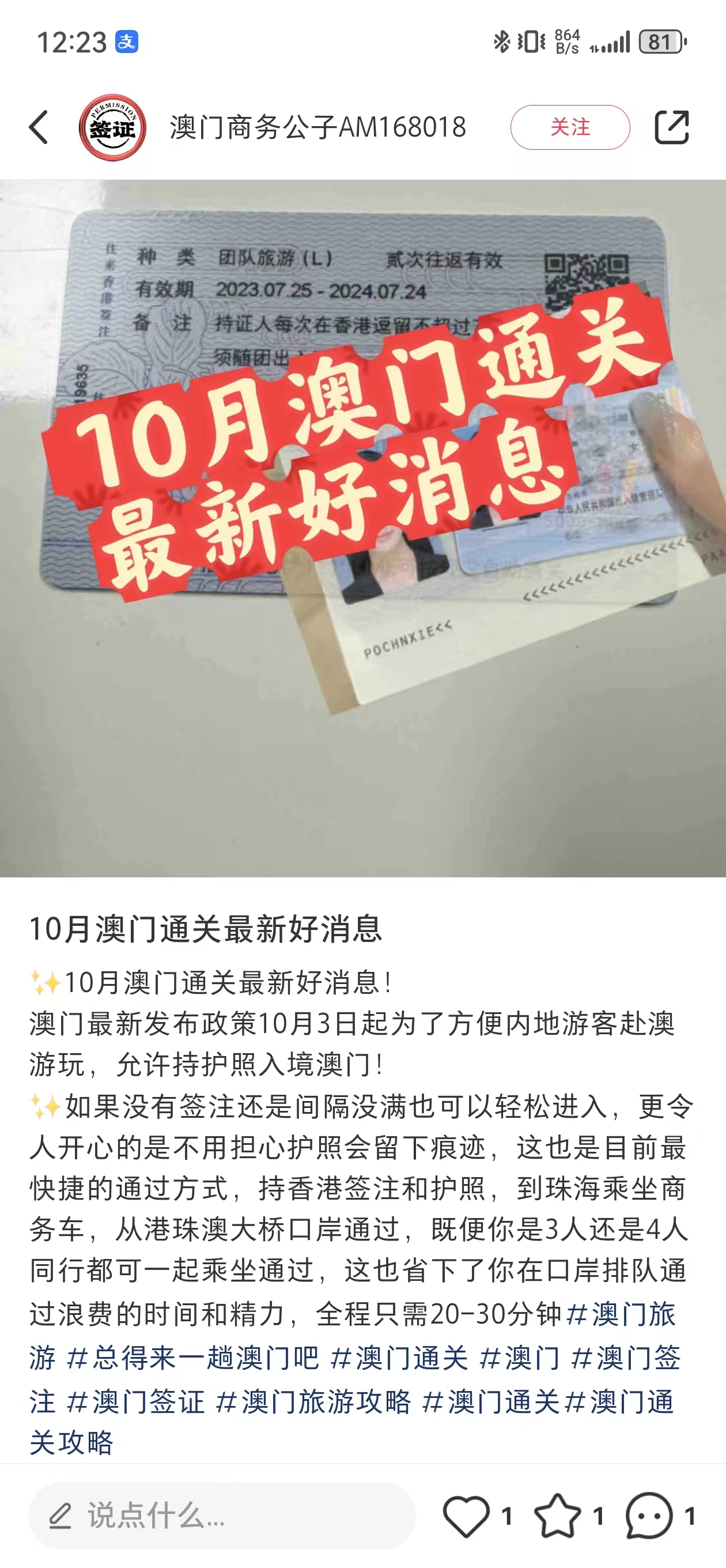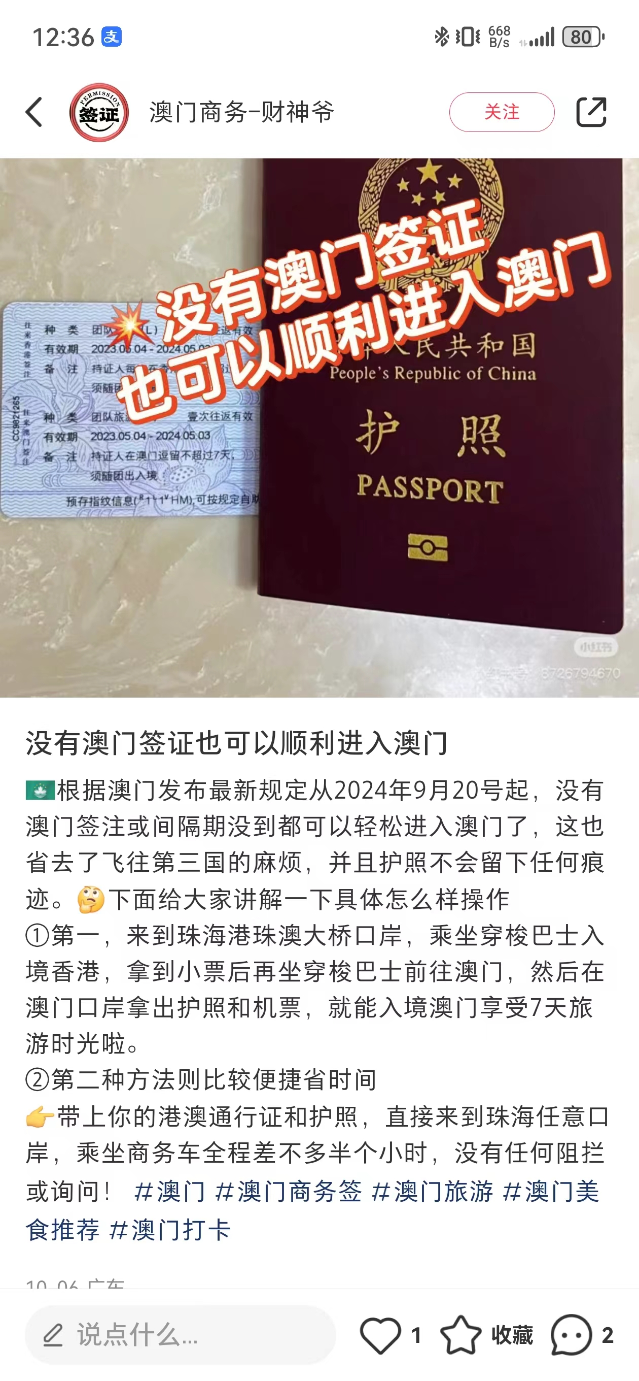 5、關於免籤:小紅薯上有很多號都宣稱澳門免籤,或者按照他的攻略,可以實現無簽註免籤進入澳門,但應該都是套路,因為他的方式就兩種,一是坐大巴通過港珠澳大橋從珠海坐到香港,再立馬從香港坐大巴回澳門,憑香港簽註就能進,你肯定會覺得這一來一回多麻煩,那就會選他提供的第二方案,就是坐他提供的商務車,通過他的“渠道”免檢查通過口岸,但是入住澳門的酒店,必須出示口岸出具的通過憑證,他這個肯定是沒有的,所以你要麼不能在澳門過夜,要麼就住他提供的酒店,説的不好聽點,這就是偷渡,這種號一般就是做酒店生意的,不能相信。