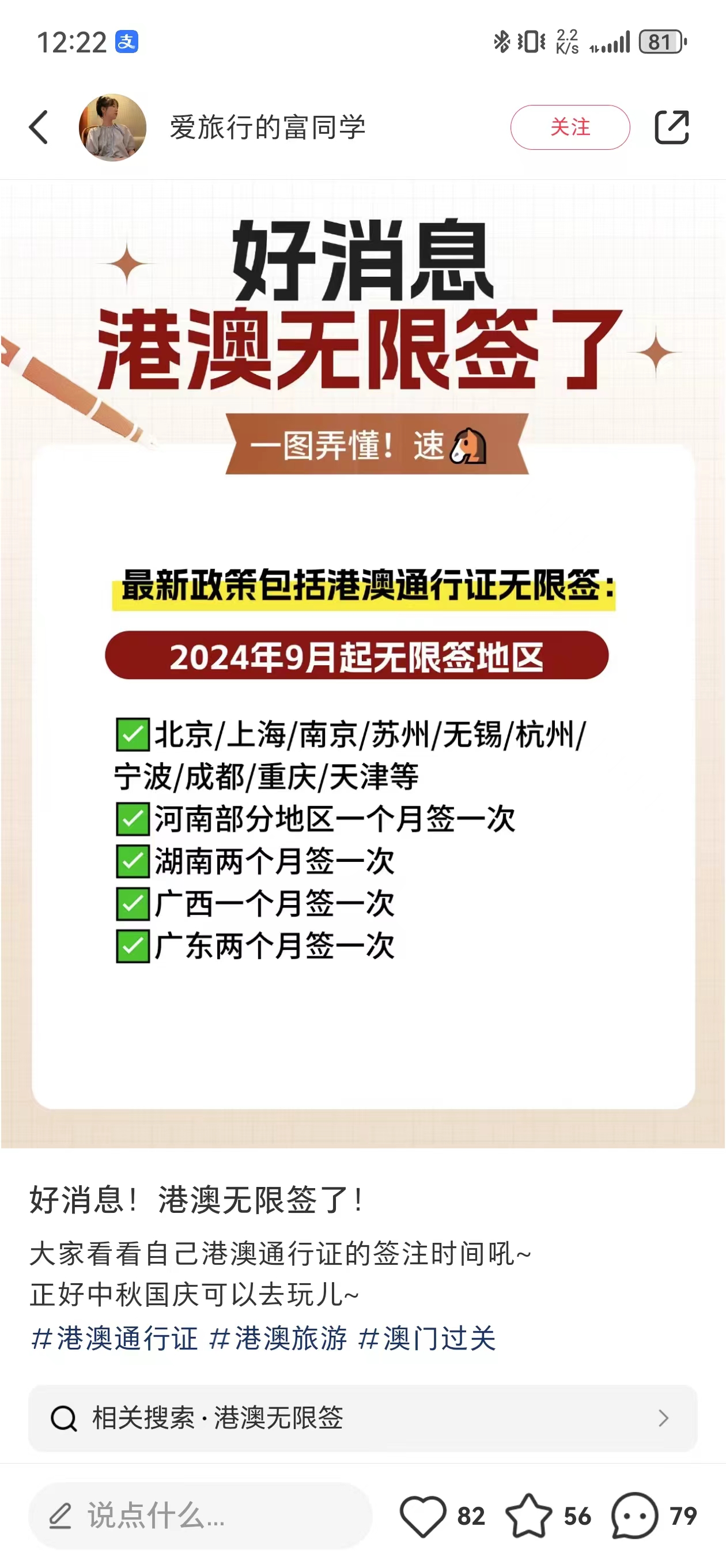 6、關於無限籤:如果你是出於工作、上學、就醫、參展等需求,可以申請特殊簽註,有效期內無限次進出澳門,這種渠道肯定是不現實的。另外還有一種無限籤的説法,北京/上海/南京/蘇州/無錫/杭州/寧波/成都/重慶/天津這些城市可以申請無限籤,我恰巧是蘇州的,本來還很興奮,仔細研究了一下發現,他的無限籤是指,你上一次簽註到期後,不用等2個月冷靜期了,可以立馬再申請一次簽註,但是一次簽註期內還是隻能進出一次澳門,並不是所謂無限次進出,而且無論你是哪裏的,只要在廣東省內續辦簽註,一律等兩個月,除非你飛回本地辦,防止你卡bug,有效期到了在珠海立馬續辦,小紅薯上宣稱通過這個渠道可以讓你進澳門的,最後都會引導你私聊他,然後賣酒店,參照上一條,下面的評論裏有本地人罵他為了賣酒店,什麼慌都敢撒。
