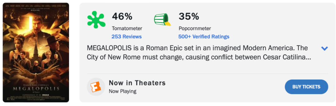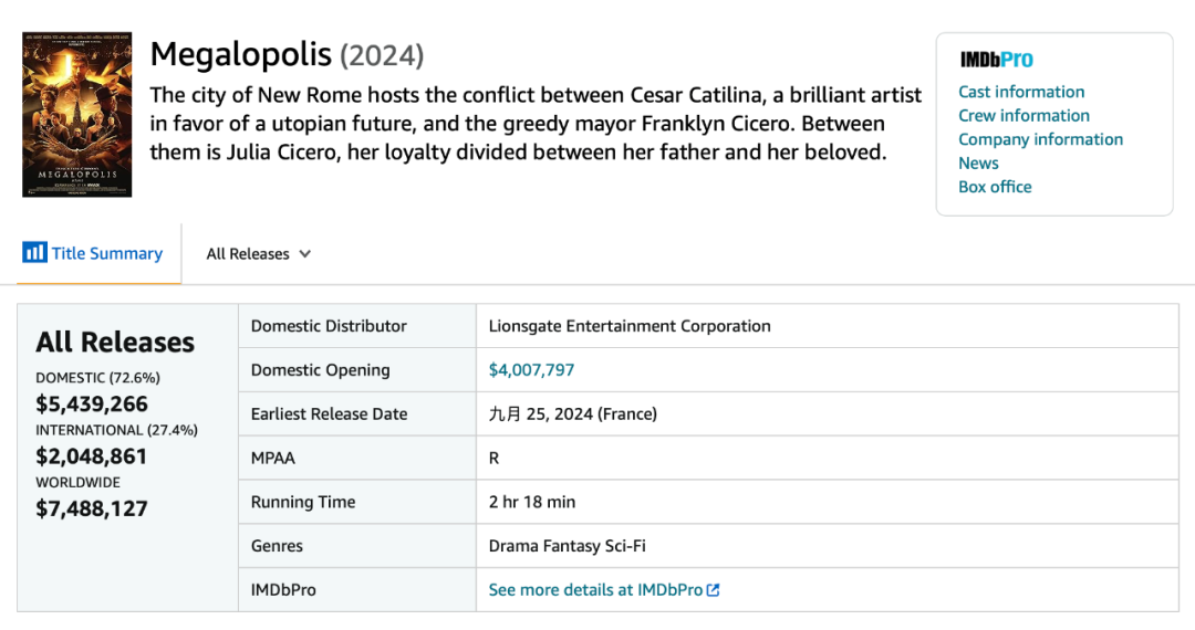 在北美,《大都會》首週末僅拿到401萬美元,創下科波拉導演作品數十年來的最低值,而媒體和觀眾的口誅筆伐更是雪上加霜;即便《大都會》還有若干海外市場待映,但對比科波拉自掏腰包投入的上億美元資金,院線端的收益並不足以填補鉅額虧空,這部野心之作的命運恐怕不容樂觀。