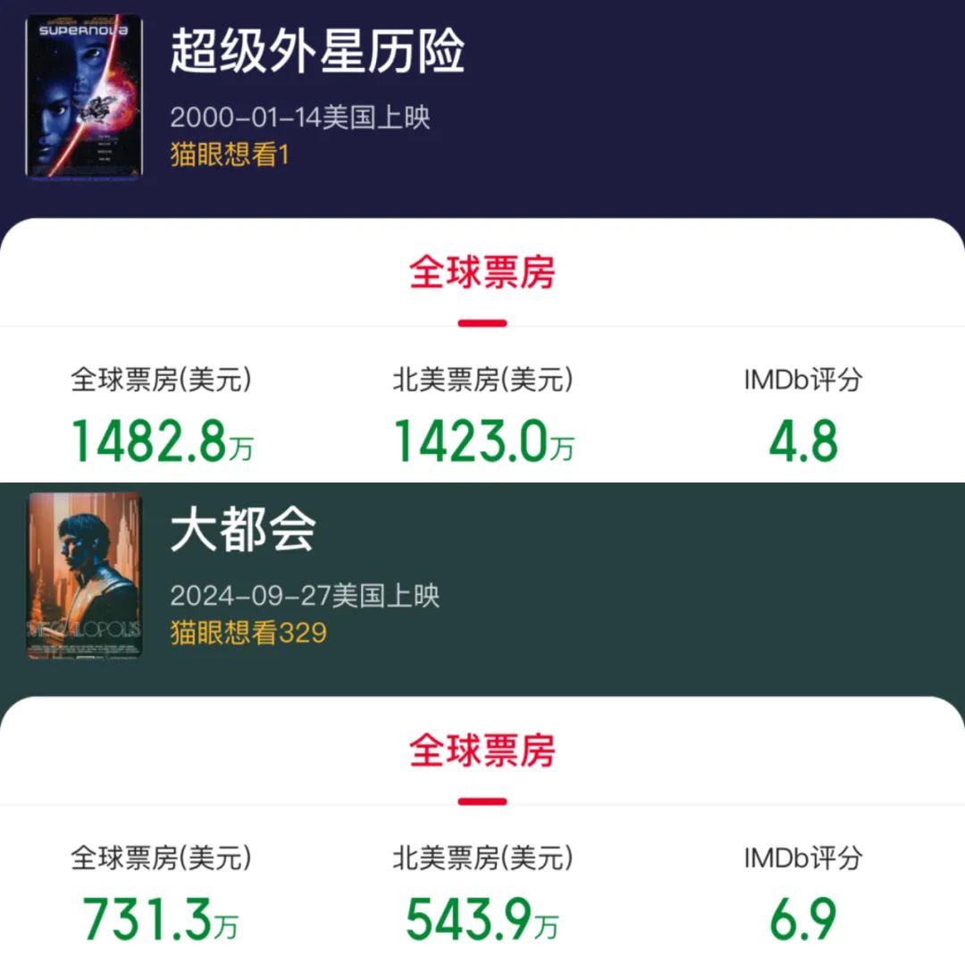 事實上,《大都會》是科波拉久違在北美大規模上映的導演作品,上一部還要追溯到2000年聯合執導的《超級外星曆險》,該片曾在2280家影院斬獲673萬美元,最終本土續航至1422萬美元。