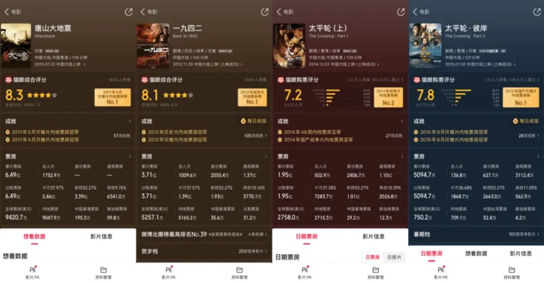 但這一災難片創作路徑從市場反響的角度來説並非屢屢奏效,幾乎無人能突破《唐山大地震》6億票房的奇蹟。到了《一九四二》,票房跳水過半;其餘的效仿者如兩部《太平輪》,票房也是節節敗退。這樣的倫理災難片很快又從市場上銷聲匿跡了。