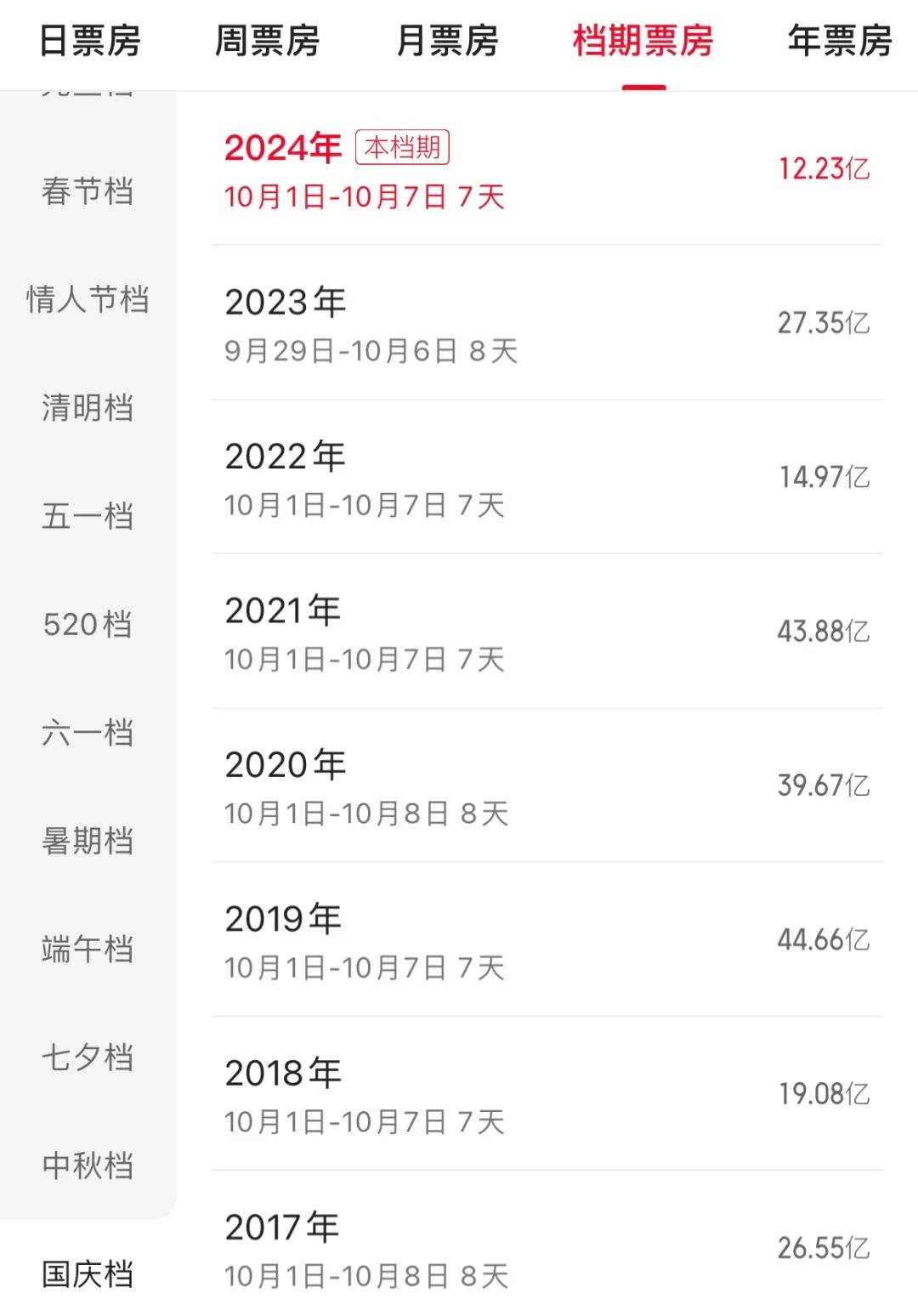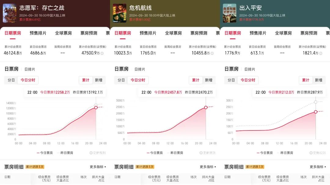 節前一天,兩部災難片《危機航線》與《出入平安》,跟《志願軍》一同搶跑。但票房卻比不上聲勢浩大。四天時間下來,《危機航線》票房為1.01億,《出入平安》則是1788.9萬,均跌出第二梯隊,表現不如人意。《出入平安》更是在昨天已經官宣撤檔,讓這個國慶檔不再有懸念。