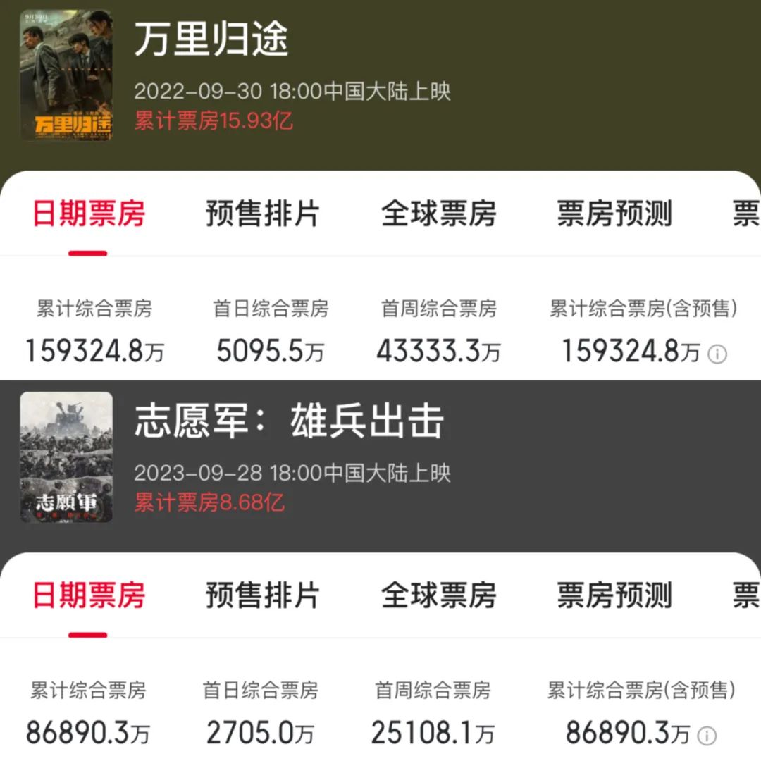 從2022年《長津湖之水門橋》之後,主旋律大片的市場風口逐漸熄火。國慶檔時,《萬里歸途》的票房下降至15億,去年的《志願軍:雄兵出擊》僅拿下8億票房。情緒性的觀影熱情逐漸消退,觀眾似乎也開始對這一類型感到審美疲勞了。